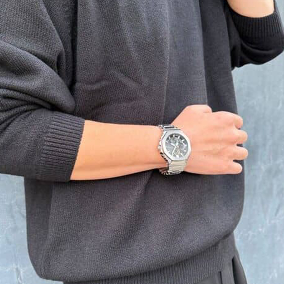 超人气的 2100 系列推出了金属表带款式哦!与 G-SHOCK全金属系列的GM-B2100不同,它采用的是轻质金属表带,所以有着比看上去更轻便的特点!而且,彩色表盘的光泽很有高级感,非常有气质!这次佩戴的 “GM-2110D-2A”是接近淡彩色的蓝色!它与手腕贴合度好,非常适合日常佩戴哦!
