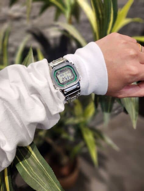 自 2018 年发售以来人气一直居高不下的GMW-B5000系列。我这次试戴的是采用绿色边框为点缀的产品哦♪其银色金属外壳给人酷炫印象,但是加入绿色点缀之后,又增添了柔和的感觉,是一款整体非常协调、平衡感很棒的产品呢!