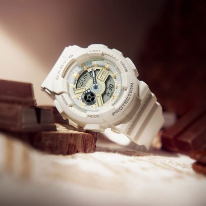 BABY-G推出巧克力主题系列表款,手表的设计采用巧克力的配色和形状,易于搭配秋冬服饰。其中,BA-130SW-5A设计灵感来自于黑巧克力,表盘的银色取自于巧克力包装上的银色锡纸,表圈和表带都呈现了黑巧克力的深棕色。BGD-565USW-5的颜色源自于牛奶巧克力,表盘内的设计体现了大板巧克力。BA-110XSW-7A则采用了白巧克力的配色。