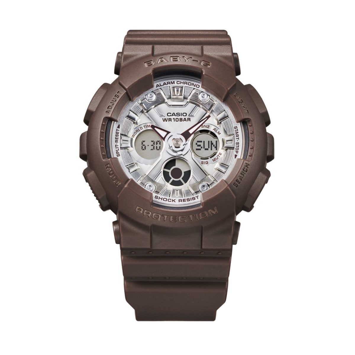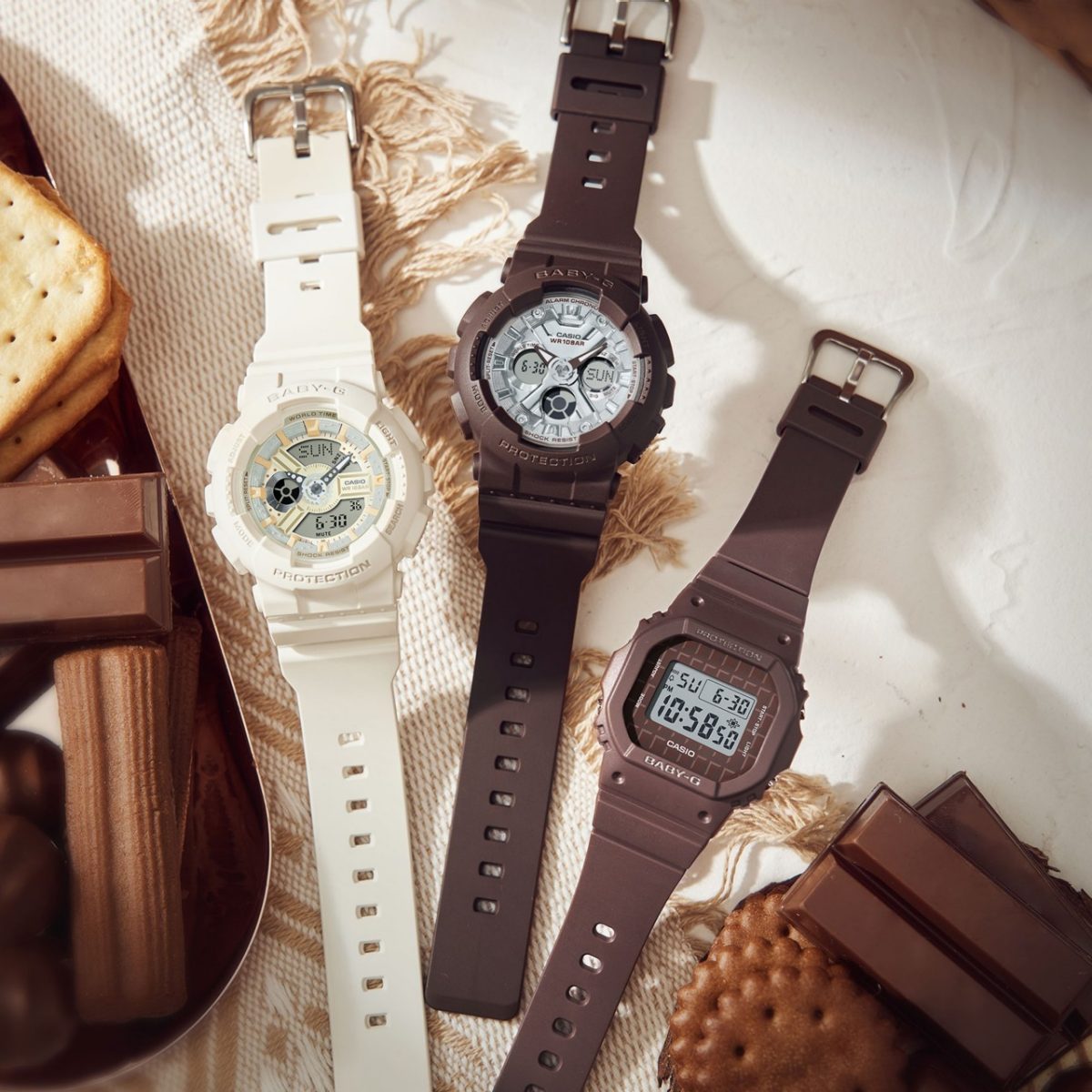 BABY-G推出巧克力主题系列表款,手表的设计采用巧克力的配色和形状,易于搭配秋冬服饰。其中,BA-130SW-5A设计灵感来自于黑巧克力,表盘的银色取自于巧克力包装上的银色锡纸,表圈和表带都呈现了黑巧克力的深棕色。BGD-565USW-5的颜色源自于牛奶巧克力,表盘内的设计体现了大板巧克力。BA-110XSW-7A则采用了白巧克力的配色。