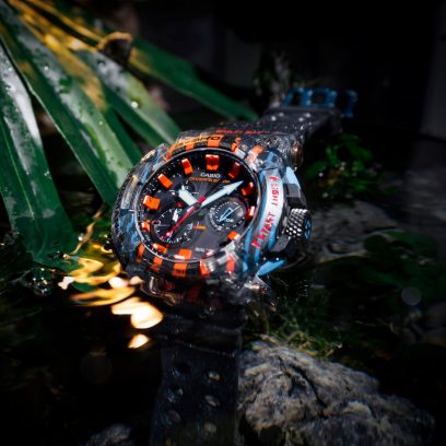 G-SHOCK MASTER OF G 推出FROGMAN「毒蛙」GWF-A1000APF-1A,此款手表的设计灵感来源于亚马逊箭毒蛙。箭毒蛙生存在南美洲亚马逊地域,它的外表很美丽很有个性,它的身体是橙红色和黑色的条纹,它的四肢是黑底蓝绿色网纹图案。整个手表的设计也呈现了箭毒蛙的特征。手表的表圈结构是双层结构,上面的一层材质采用碳纤维和玻璃纤维,外观上呈现箭毒蛙身体的颜色,在这一层表圈下方还有一层碳材质,用于加固,保护整个手表。手表的表带也采用特殊的材质,看起来更像箭毒蛙的皮肤表面。同时,背刻呈现箭毒蛙的形象,还印有蛙人30周年的标志。